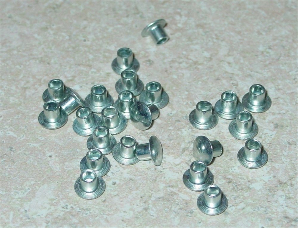 You are purchasing twenty five of the semi tubular rivets shown in the above picture. These are 1/8" rivets and 1/8" in length. Nickel plated to match most of the toy bumpers I sell in my store and available in many different lengths. I also carry the c-clamp style rivet tool for using these rivets to give your project a professional finished look. We are your one stop shop for all your toy restoration needs.