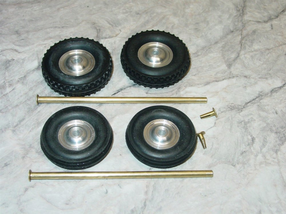 You are purchasing one set of the above pictured parts. Nice replacement true vulcanized rubber (will no flat spot from sitting) set of tires with turned aluminum wheels and brass axles for use on the Cox Thimble Drome pusher style Champion racer. The Champion racer is the larger of the two cars made by Cox. Axles are sized to fit that car and are about 5" and 5-1/4" long. As with anything whether it is toy parts or full size car parts, some items may require some adjustment or fitting or slight modifications for use on your specific item. We do our best to get these replacement parts to as close to original specs as possible. If you are having difficulties with this, please feel free to message us for assistance. We are your one stop shop for all your toy restoration needs.