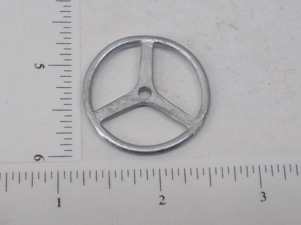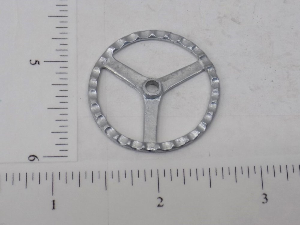 You are purchasing one of the above pictured parts. Picture shows both front and back but listing is for ONE wheel. Nice replacement cast zinc/aluminum alloy three spoke 1.25" diameter steering wheel to dress up your custom tether car project. Use ruler in picture for sizing questions. As with anything whether it is toy parts or full size car parts, some items may require some adjustment or fitting or slight modifications for use on your specific item. We do our best to get these replacement parts to as close to original specs as possible. If you are having difficulties with this, please feel free to message us for assistance. We are your one stop shop for all your toy restoration needs.