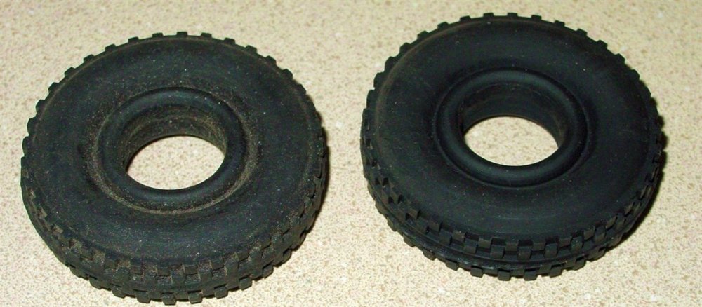 You are purchasing one pair of the above pictured parts. Nice replacement true vulcanized rubber (will no flat spot from sitting) pair of tires for use on the Cox Thimble Drome Champion racer rear tires. Will work only on the gas powered variation with the two piece wheels and are nice and pliable for easy installation. As with anything whether it is toy parts or full size car parts, some items may require some adjustment or fitting or slight modifications for use on your specific item. We do our best to get these replacement parts to as close to original specs as possible. If you are having difficulties with this, please feel free to message us for assistance.**Vehicles in pictures are NOT for sale, they are EXAMPLES ONLY** We are your one stop shop for all your toy restoration needs.
