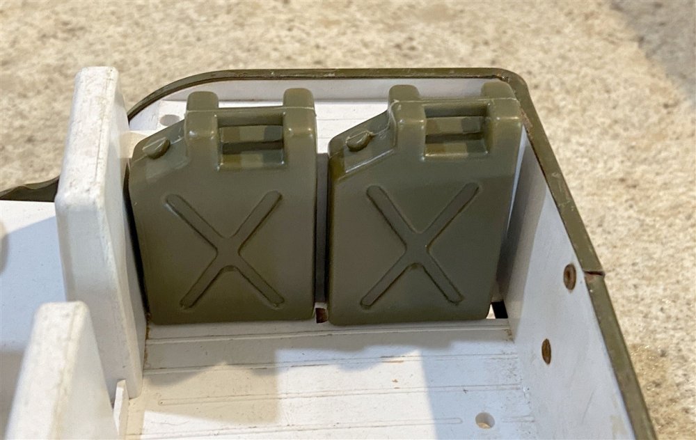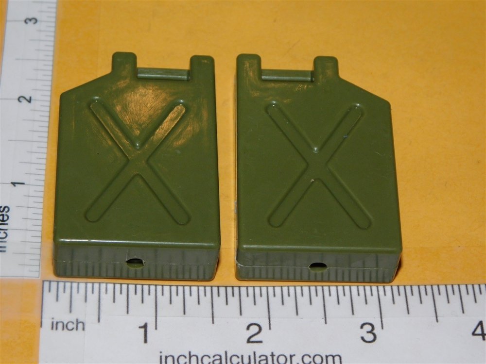 Very neat set of custom reproduction injection mold plastic army gas and or water cans. Sized perfect for the standard sized Tonka army jeep as pictured. Jeep is NOT included as part of the listing and is shown for display purposes only. Awesome accessory pieces for the Tonka or Jeep or military collector. If you're not familiar with Tonka Jeep sizing, each measures 1-3/8" by 2" by 1/2". Molded in olive drab but could easily be painted for use with other toys.