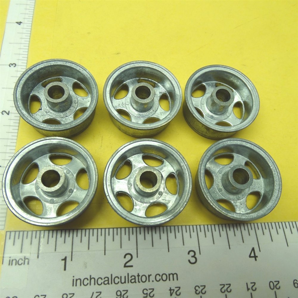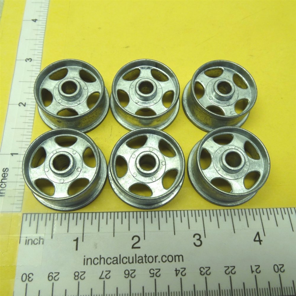 You are purchasing six (6) of the above pictured part. Picture shows both front and back. This is a nicely made cast zinc/aluminum alloy wheel for use on the Smith Miller L-Mack and B-Mack style trucks from the 1950's Also have these available chrome plated as well as the other style Smith Miller wheels is separate listings. Use ruler in picture for sizing questions. As with anything whether it is toy parts or full size car parts, some items may require some adjustment or fitting or slight modifications for use on your specific item. We do our best to get these replacement parts to as close to original specs as possible. If you are having difficulties with this, please feel free to message us for assistance. We are your one stop shop for all your toy restoration needs.