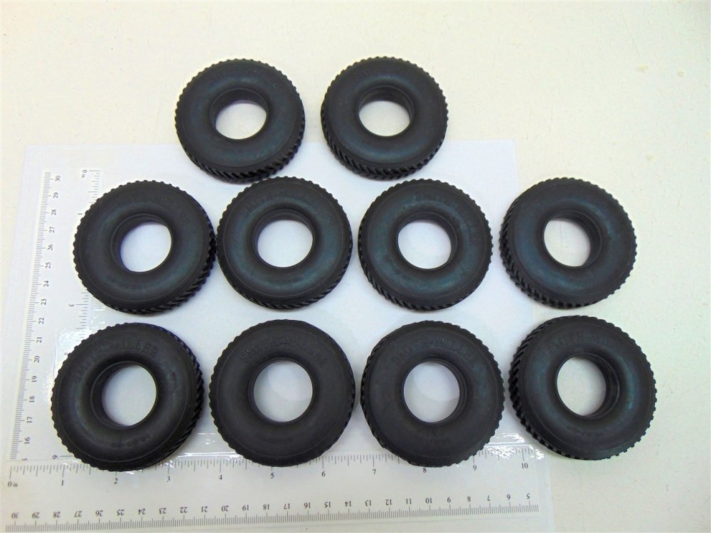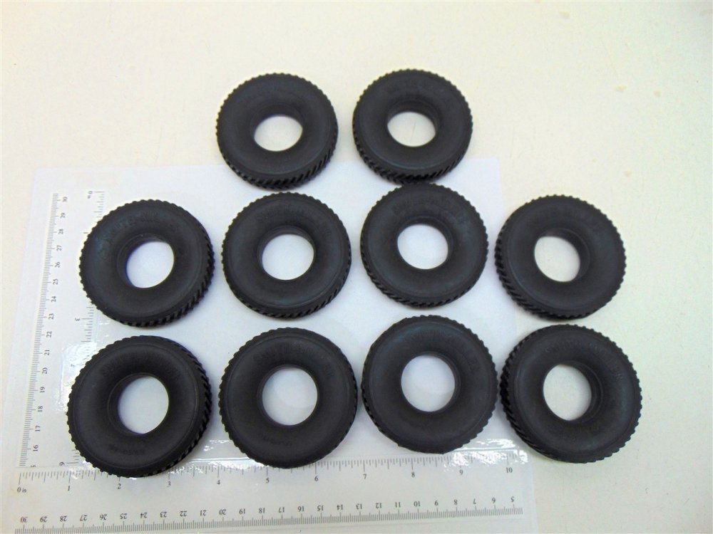 You are purchasing a set of 10 of the above pictured part. This is a nicely made true vulcanized rubber herringbone tread with script sidewalls for use on the Smith Miller B-Mack style trucks from the 1950's Also have the other style Smith Miller tires in separate listings. Use ruler in picture for sizing questions. As with anything whether it is toy parts or full size car parts, some items may require some adjustment or fitting or slight modifications for use on your specific item. We do our best to get these replacement parts to as close to original specs as possible. If you are having difficulties with this, please feel free to message us for assistance.International purchasers, to receive combined shipping on multiple items won, please DO NOT pay until you've received an invoice from us to reflect the multiple items. Be sure to check out our eBay Store as we have over 500 toy parts listings and over 1500 toy decal listings. We are your one stop shop for all your toy restoration needs.