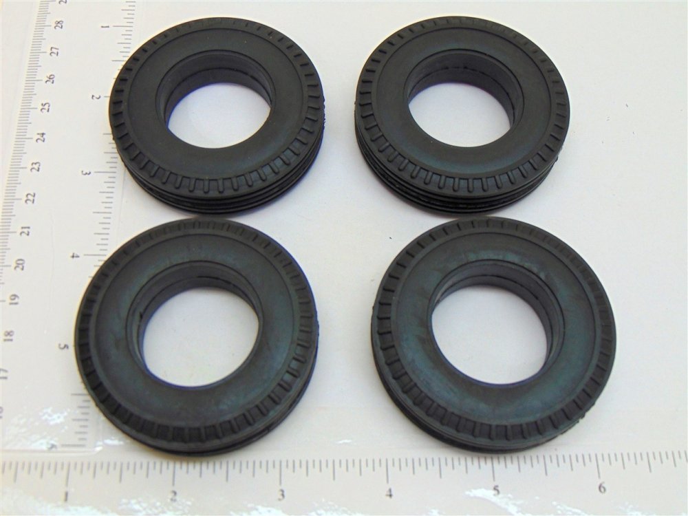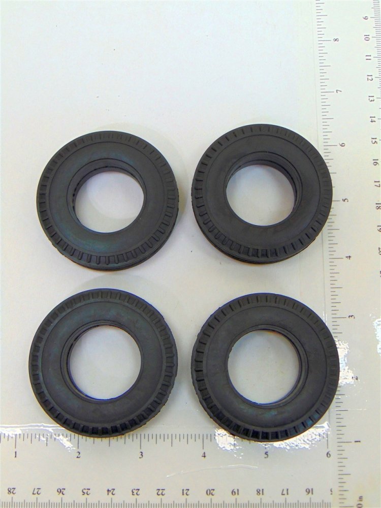 You are purchasing a set of 4 of the above pictured part. This is a nicely made true vulcanized rubber highway tread tire for use on the Smith Miller GMC style trucks from the 1950's Also have the other style Smith Miller tires in separate listings. Use ruler in picture for sizing questions. As with anything whether it is toy parts or full size car parts, some items may require some adjustment or fitting or slight modifications for use on your specific item. We do our best to get these replacement parts to as close to original specs as possible. If you are having difficulties with this, please feel free to message us for assistance.International purchasers, to receive combined shipping on multiple items won, please DO NOT pay until you've received an invoice from us to reflect the multiple items. Be sure to check out our eBay Store as we have over 500 toy parts listings and over 1500 toy decal listings. We are your one stop shop for all your toy restoration needs.