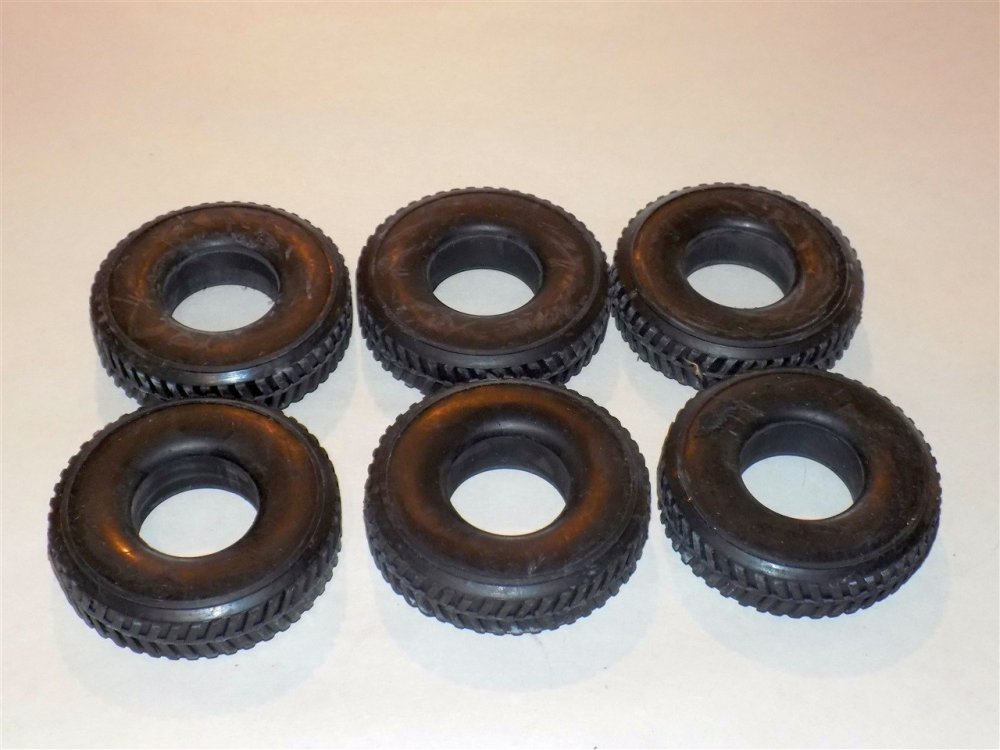 You are purchasing a set of 6 of the above pictured part. This is a nicely made true vulcanized rubber herringbone tread with smooth sidewalls for use on the Smith Miller L-Mack style trucks from the 1950's Also have the other style Smith Miller tires in separate listings. Use ruler in picture for sizing questions. As with anything whether it is toy parts or full size car parts, some items may require some adjustment or fitting or slight modifications for use on your specific item. We do our best to get these replacement parts to as close to original specs as possible. If you are having difficulties with this, please feel free to message us for assistance. We are your one stop shop for all your toy restoration needs.