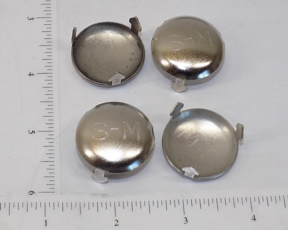 You are purchasing one set of 4 of the above pictured part. Picture shows both front and back but listing price is for a full set of 4 pieces. This is a nicely made stamped steel with chrome plating hubcap for use on the Smith Miller GMC and Chevy style trucks from the 1950's Has the S-M engraved as visible. Also have the other style Smith Miller caps in separate listings. Use ruler in picture for sizing questions. As with anything whether it is toy parts or full size car parts, some items may require some adjustment or fitting or slight modifications for use on your specific item. We do our best to get these replacement parts to as close to original specs as possible. If you are having difficulties with this, please feel free to message us for assistance.**Vehicles in pictures are NOT for sale, they are EXAMPLES ONLY** We are your one stop shop for all your toy restoration needs.