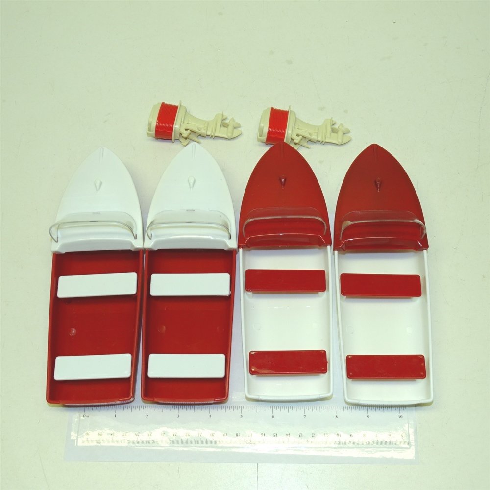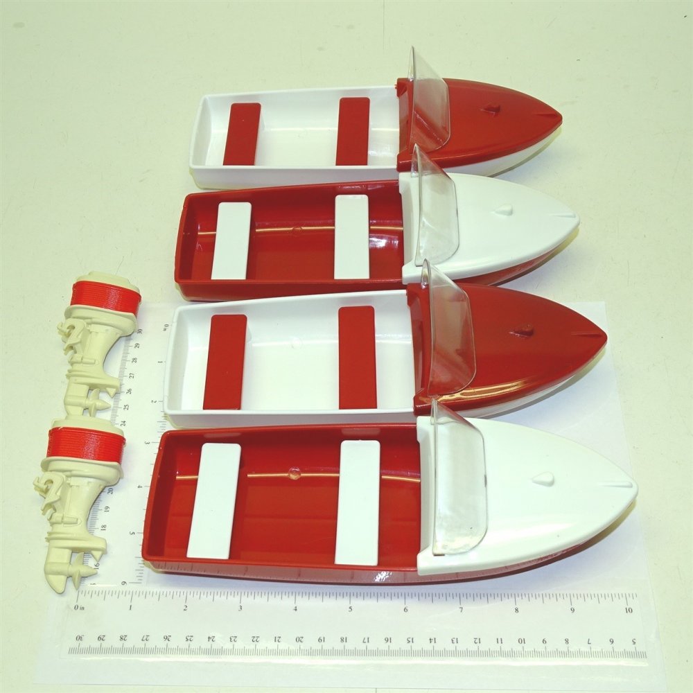 You are purchasing one set of the parts as shown in the above picture. Nicely made injection mold plastic set of four Tonka rowboats (2 white, 2 red) with decks, seats, and windshields along with a pair of outboard motors. This is the full set that would go with the Tonka Marine Transport semi truck and trailer all for one money. As with anything whether it is toy parts or full size car parts, some items may require some adjustment or fitting or slight modifications for use on your specific item. We do our best to get these replacement parts to as close to original specs as possible. If you are having difficulties with this, please feel free to message us for assistance. We are your one stop shop for all your toy restoration needs.